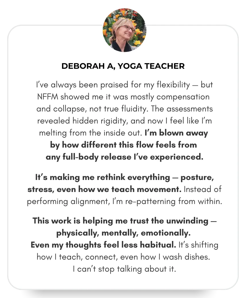 Why start here: Experiencing NeuroFascial Flow® in your own system sharpens clinical eyes, protects your nervous system, and lets you give clients a powerful between-visit runway straight away.